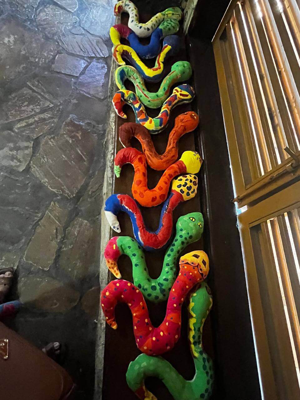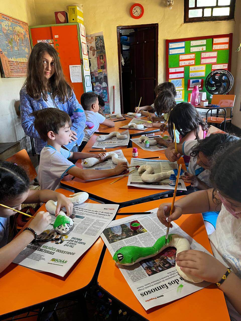 Marina trouxe de casa um livro com a história do Boitatá. Depois da contação, cada um criou o seu próprio boitatá em forma de boneco de pano. As estruturas já estavam preparadas com a costura feita por sua mãe, Fernanda, e coube a cada criança dar vida à criação pintando e colorindo como quisesse.