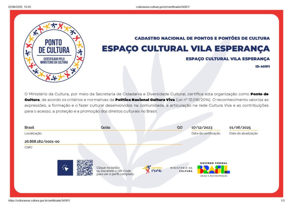 O Espaço Cultural Vila Esperança conquistou, no dia 7 de dezembro de 2023, o reconhecimento oficial como Ponto de Cultura pelo Ministério da Cultura, por meio da Secretaria de Cidadania e Diversidade Cultural. A certificação foi concedida com base nos critérios da Política Nacional Cultura Viva (Lei nº 13.018/2014).